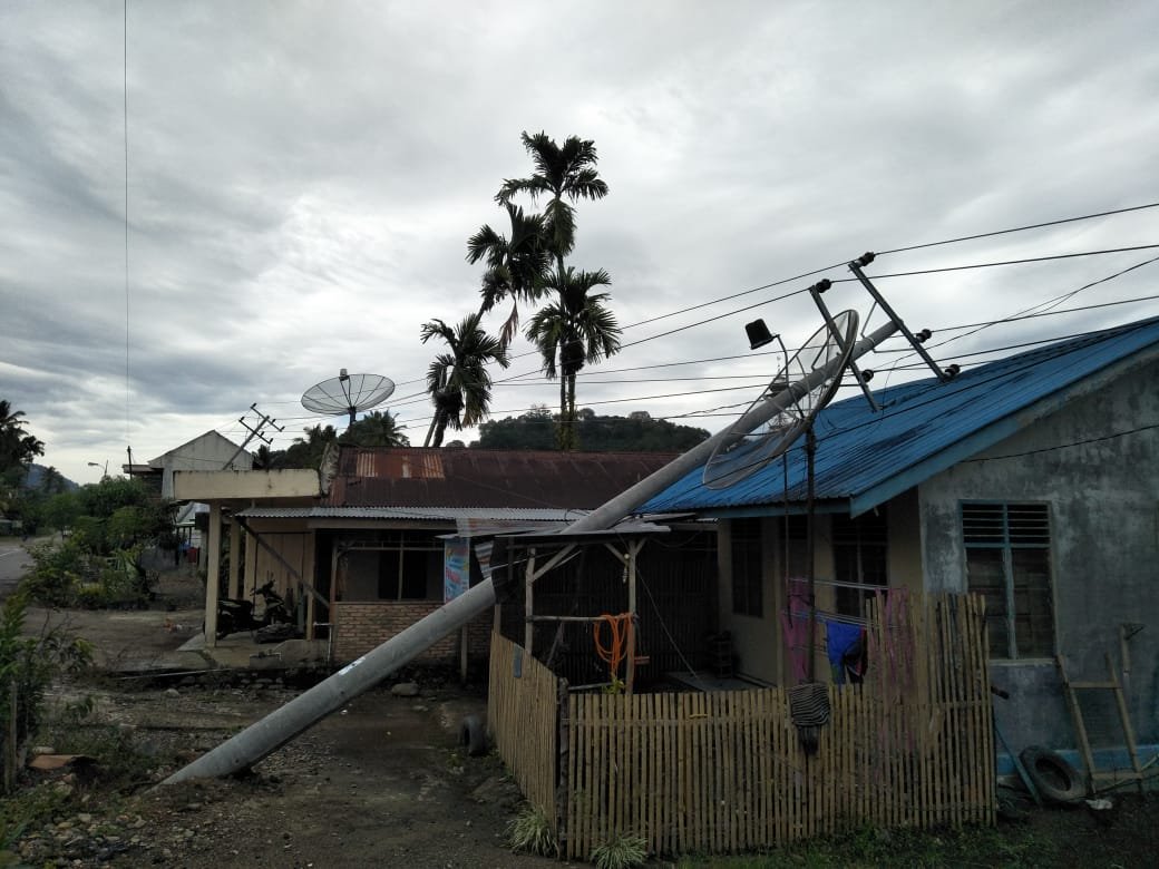 “Hujan lebat dan angin kencang yang terjadi Rabu sore menyebabkan tanah labil dan tiang tumbang. Awalnya, satu tiang, namun tidak berapa lama diikuti tiang yang lain. Jumlah tiang yang tumbang dan miring seluruhnya mencapai 8 tiang. Selain tumbang, satu tiang listrik sempat menimpa rumah warga”, ujarnya.