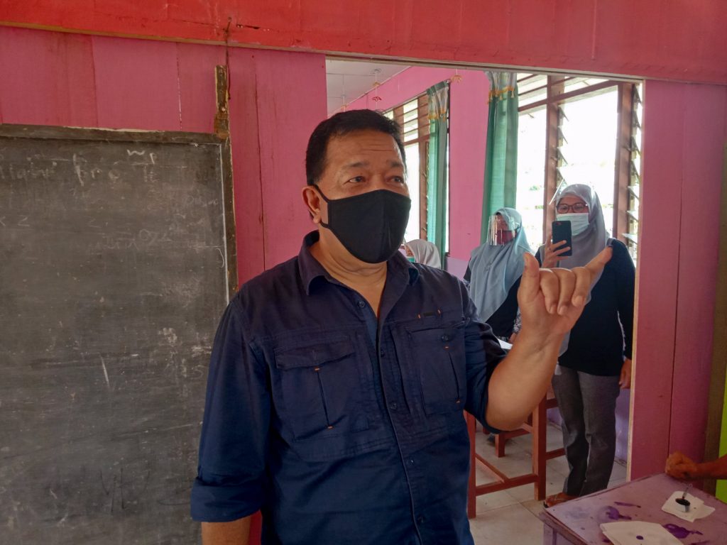 Bupati Madina aktif ini tiba dengan mengendarai mobil pribadi yang diantar supir. Tiba di TPS, Dahlan langsung mencuci tangan sebagai bagian dari pencegahan penyebaran Covid-19 dab mendaftarkan diri untuk melakukan pencoblosan.
