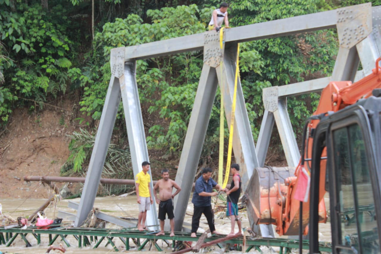 “ Sebelum air meluap lagi kedua rangka jembatan ini diusahakan untuk di angkat dari dalam sungai,”