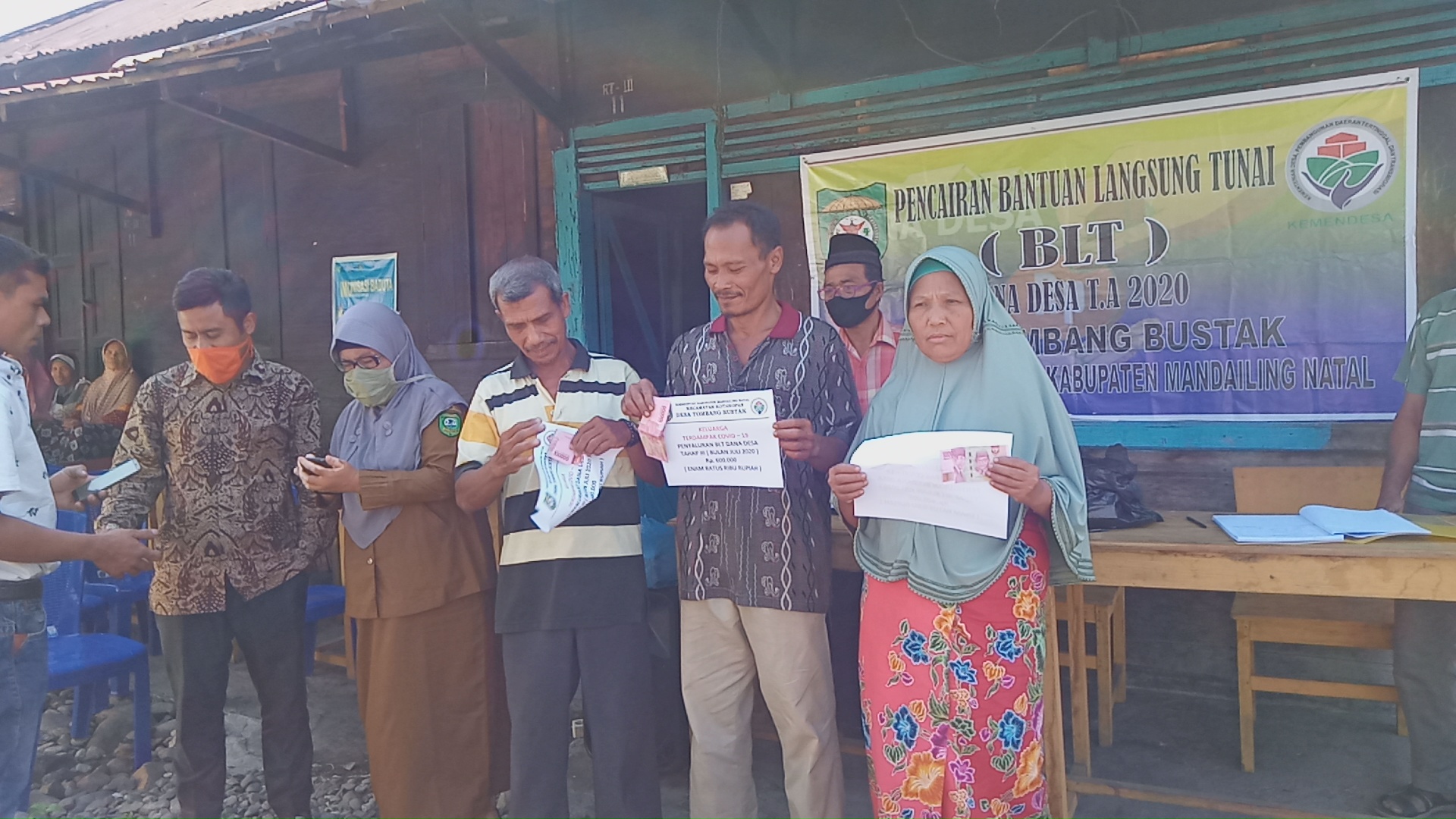Penyerahan BLT-DD ini dilaksanakan di halaman Kantor Desa dengan dihadiri perwakilan Muspika Kotanopan; Kepala Desa Tombang Bustak, Kresna Halomoan; Sekretaris Desa, Martua Halomoan; Ketua BPD, Usman Lubis dan Pendamping Desa, Akhir Lubis. Sedangkan penyaluran BLT-DD ini dari awal sampai selesai berlangsung dengan aman dan baik.