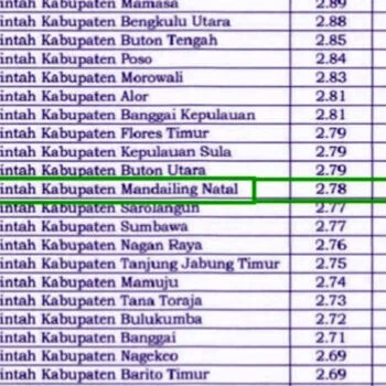 Nilai ini menempatkan Madina di bawah beberapa kabupaten lain dalam daftar evaluasi tersebut, seperti Kabupaten Buton Utara (Indeks 2.79) dan berada tepat di atas Kabupaten Sarolangun (Indeks 2.77).