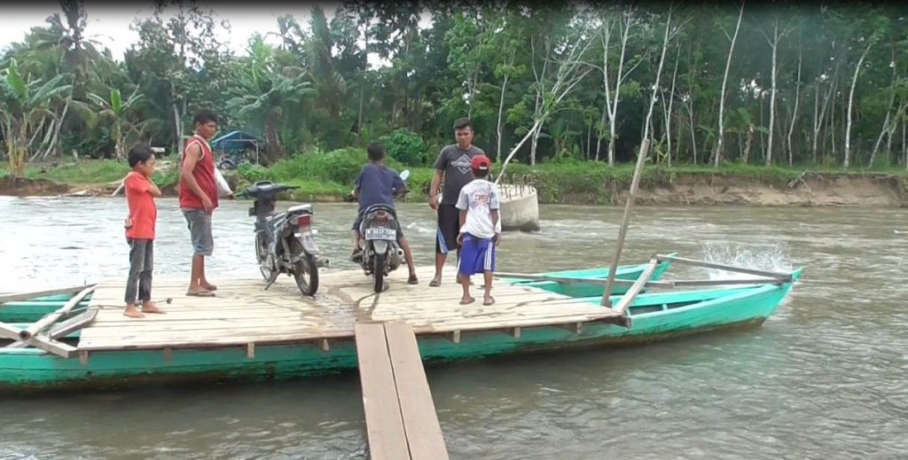 Akibat jembatan rusak, sebagian warga empat desa terpaksa menyeberangi sungai sepanjang lima puluh meter-dengan kedalaman 2 meter lebih-menggunakan perahu rakitan atau getek setiap harinya.