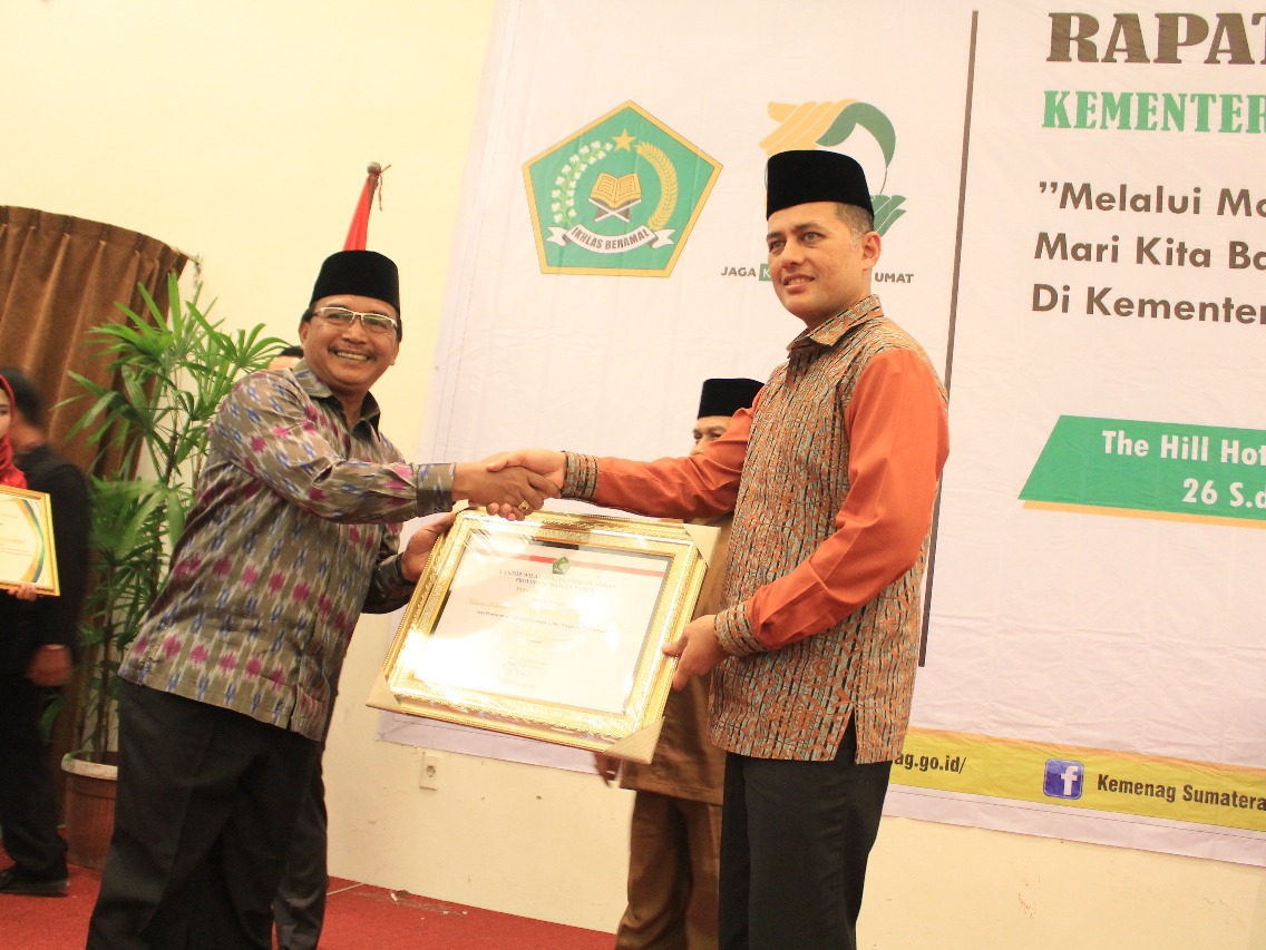 Penghargaan tersebut diterima Kepala Kantor Kementerian Agama Kabupaten Mandailing Natal Dr. H. Dur Brutu, MA, yang diserahkan langsung Wakil Gubernur Sumatera Utara H. Musa Rajekhsah, M.Hum yang didampingi Kepala Kanwil Kemenag Sumatera Utara H. Iwan Zulhami, SH, MAP di The Hill Hotel And Resort Sibolangit Deli Serdang saat acara Rapat Kerja Wilayah Kementerian Agama Provinsi Sumatera UtaraTahun 2019, Selasa, (26/2).