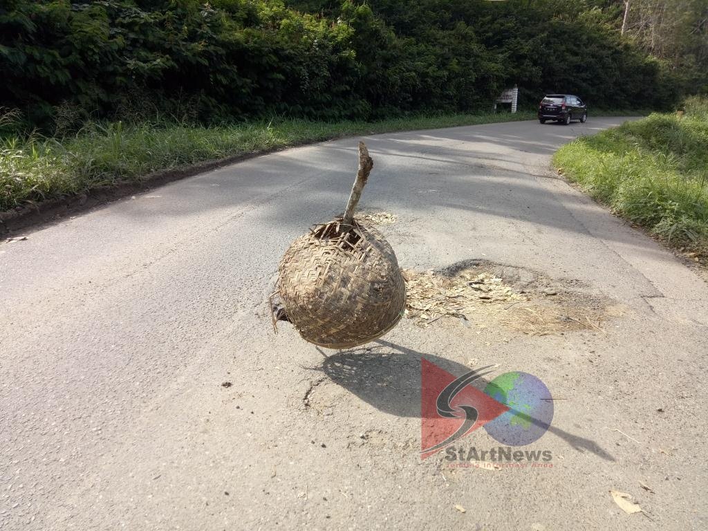Panyabungan.StArtNews-Kerusakan jalan negara Panyabungan – Kotanopan semakin parah,  untuk menghindari kecelakaan warga terpaksa memasang keranjang di tengah jalan sebagai pertanda ada lobang yang menganga.