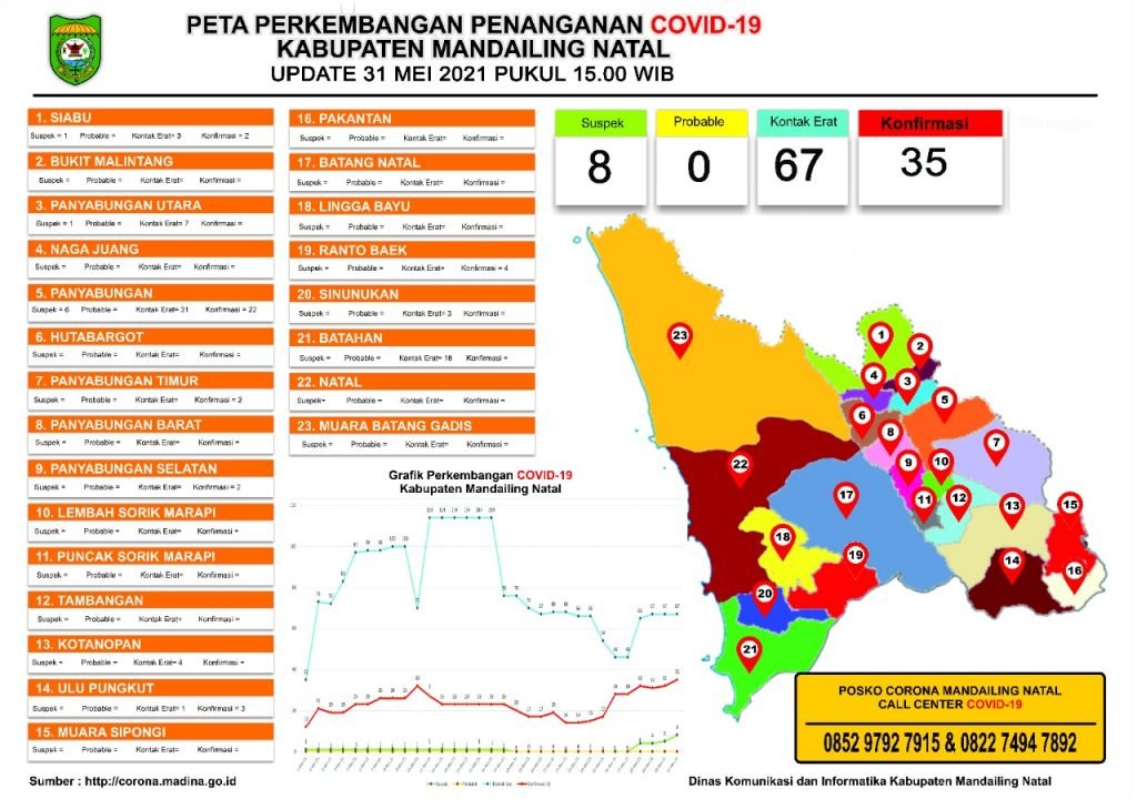 Madina, StArtNews – Berdasarkan update peta perkembangan penanganan COVID-19 Kabupaten Mandailing Natal (Madina), Senin (31/5) jumlah orang yang terkonfirmasi sudah mencapai 35 orang sedangkan probable nihil, suspek delapan orang dan kontak erat tercatat 67 orang.
