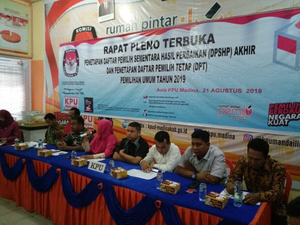 Penetapan DPT dilaksanakan KPU Madina melalui Rapat Pleno terbuka, Selasa (21/8) di aula Kantor KPU Madina yang dibuka Plh. Ketua KPU Madina Maskhairani.