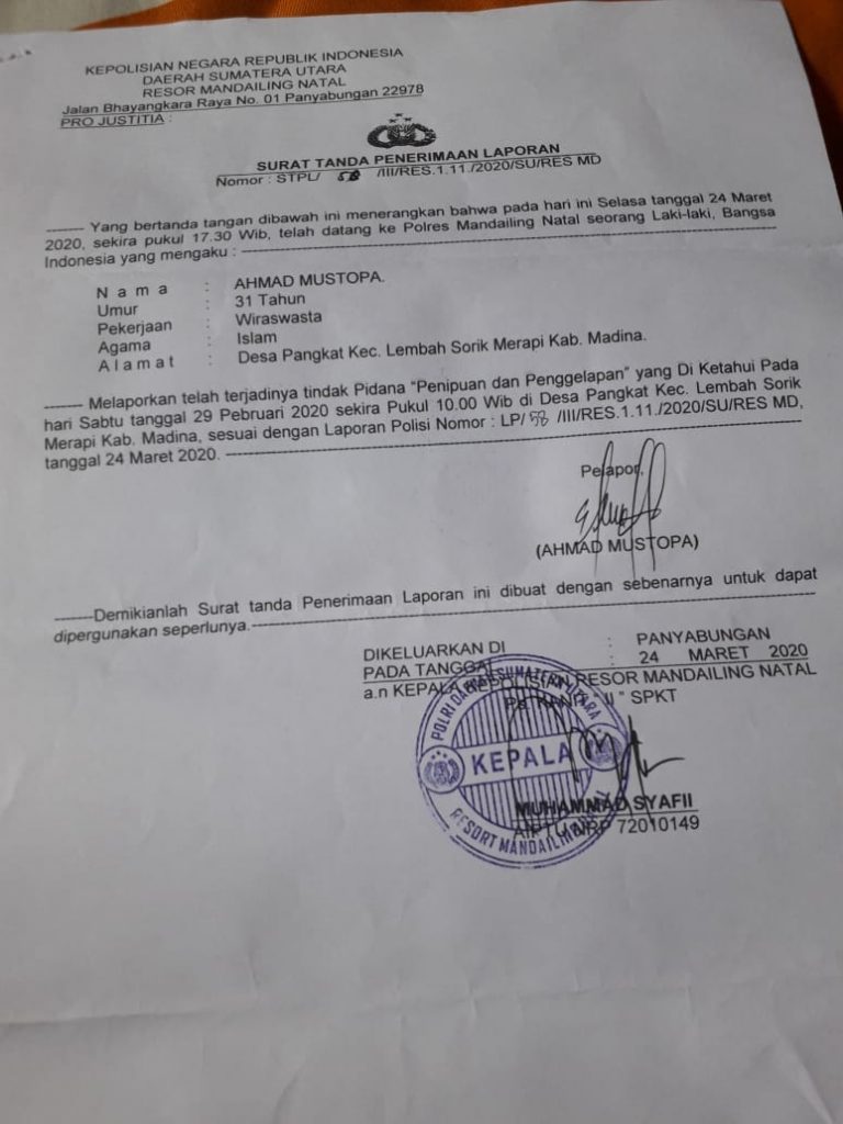 Belakangan orang tua Erik, Rosmiati membuat perjanjian akan membayar uang tersebut kepada Mustopa paling lambat 18 Maret 2020. Setelah melakukan pengiriman sebanyak 2 kali dengan total Rp14.950.000,- Rosmiati tiba-tiba tidak bisa dihubungi. Bahkan tidak mau mengangkat telepon dari Mustopa.