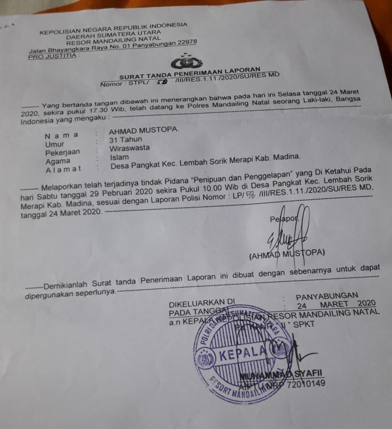 Karena pelaku tak kunjung datang, kata Mustopa, ia dan korban lainnya berusaha menjumpai pelaku di kediamannya di Rao, Pasaman. Saat itu pelaku meminta korban untuk bersabar beberapa hari lagi karena dia belum menerima uangnya dari rumah potong.