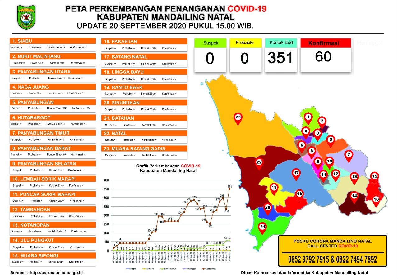 Berdasar data yang dikeluarkan oleh tim Gugus Tugas Percepatan Penanganan (GTPP) Covid-19 Madina pada Minggu (20/9) pasien positif saat ini berjumlah 60 orang. Bertambah 3 pasien dari hari sebelumnya. Ketiga pasien itu merupakan pasien tanpa gejala dan saat ini sudah berada di bawah pantauan RSUD Panyabungan.