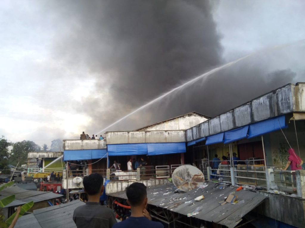 Akibat musibah kebakaran yang terjadi di hari kedua perayaan Idul Fitri, ratusan kios pedagang dari dua los ludes terbakar