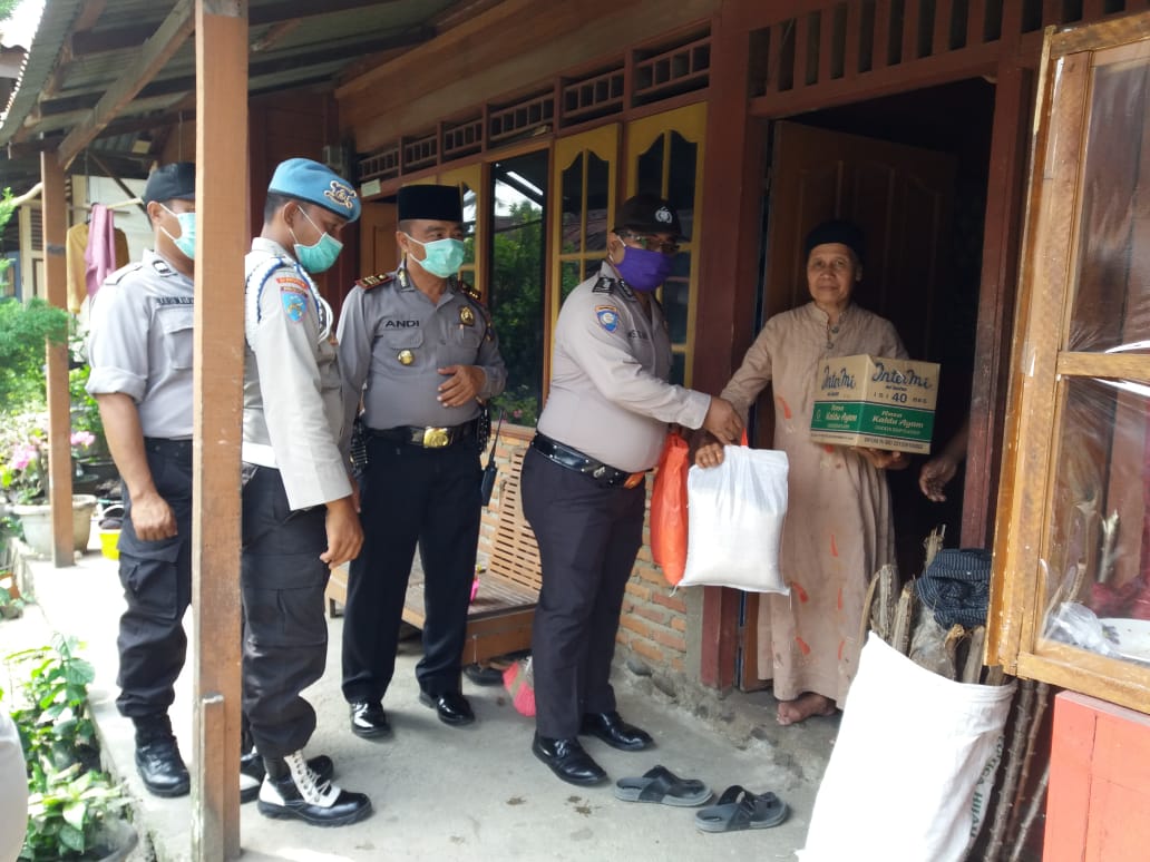 Foto: Kapolsek Kota Panyabungan, AKP Andi Gustawi bersama personel ketika menyerahkan bantuan sembako kepada masyarakat yang terdampak pandemi Covid-19.