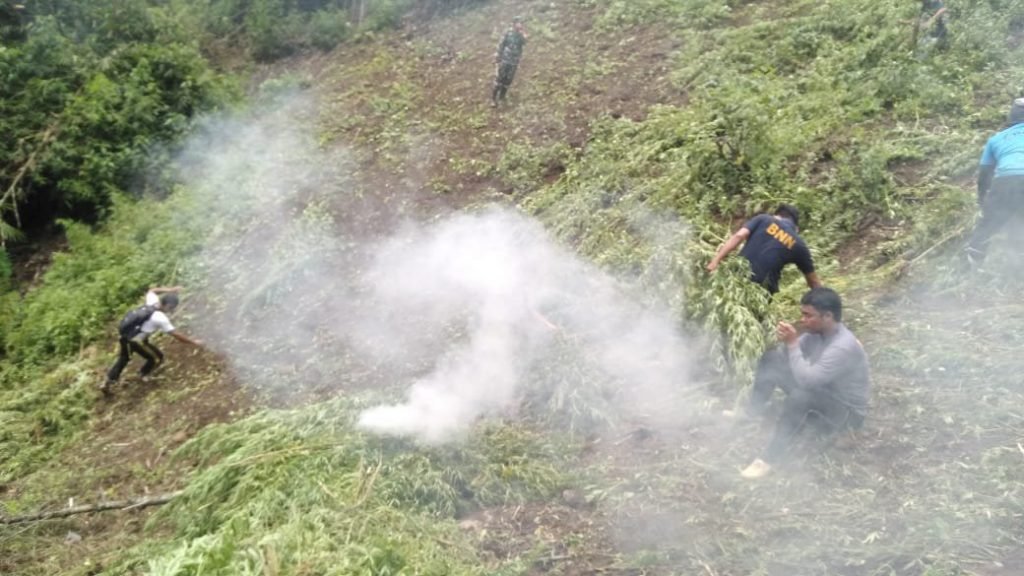 Ribuan batang pohon ganja yang ditemukan merupakan ganja yang siap panen. Petugas pun mencabut dan memusnahkannya dengan cara dibakar.