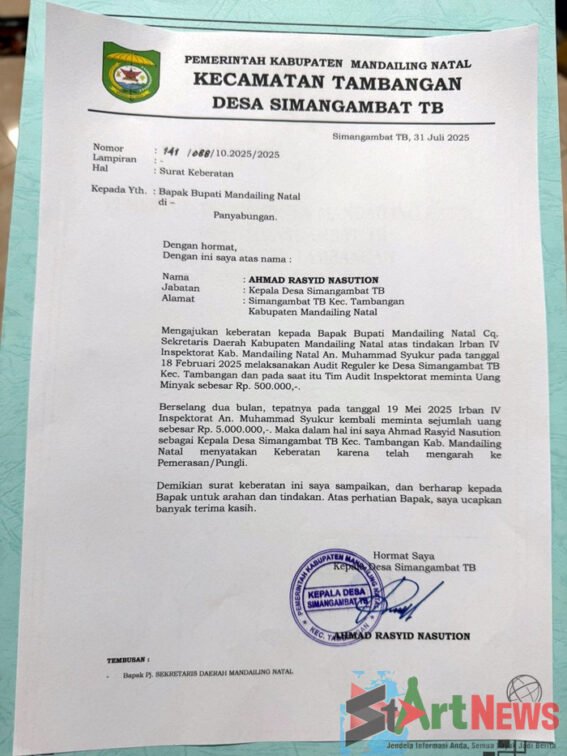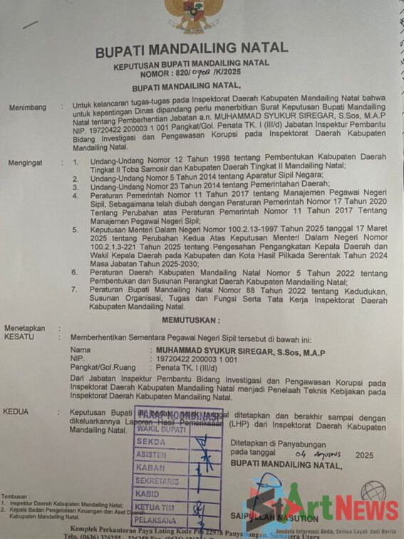 Panyabungan, StartNews – Bupati Mandailing Natal (Madina) H. Saipullah Nasution memberhentikan Muhammad Syukur Siregar dari jabatan Inspektur Pembantu (Irban) bidang Investgiasi dan Pengawasan Korupsi pada Inspektorat Madina. Pemberhentian itu tertuang dalam Surat Keputusan Bupati Madina Nomor: 820/0708/K/2025 tertanggal 4 Agustus 2025. Dalam SK tersebut, bupati Madina memutasi Muhammad Syukur Siregar […]